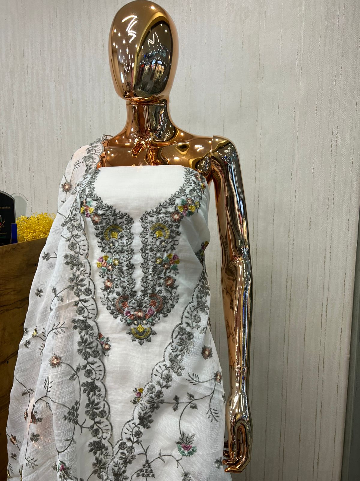 Semi linen material set with machine embroidery